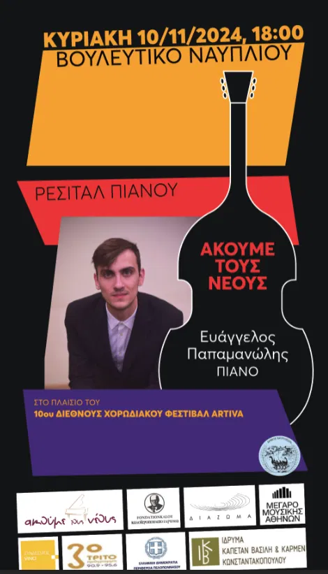- Σαββατο 14 Δεκεμβρίου: Ρεσιτάλ πιάνου του Ευάγγελου Παπαμανώλη στην Αρχαία Κόρινθο και στο πλαίσιο του 2ου Συμποσίου του Προγράμματος “Ακούμε τους Νέους” με τη συμμετοχή του διεθνούς φήμης κλαρινετίστα Σπύρου Μουρίκη. Η συναυλία θα ηχογραφηθεί και θα παρουσιαστεί στην εκπομπή του Χρίστου Παπαγεωργίου “Η Κυρία με τη Στρυχνίνη” στις 16.12.2024