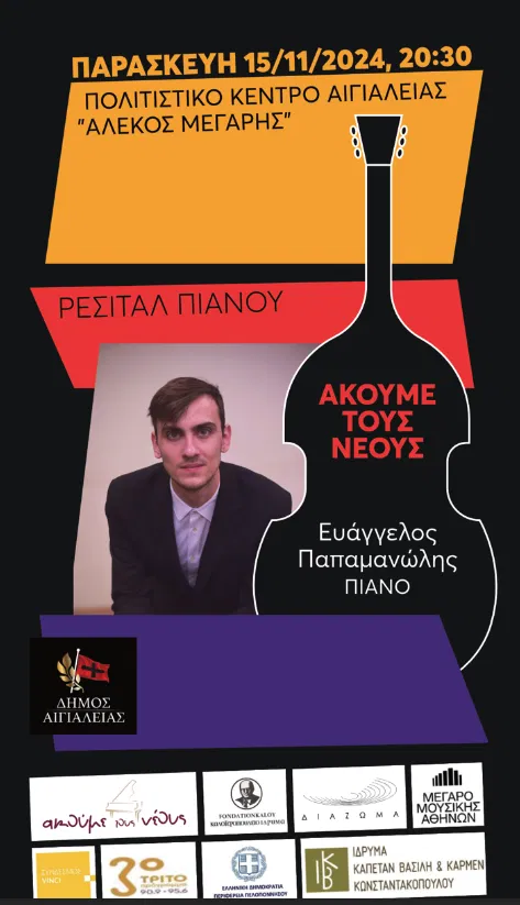 - Παρασκευή 15 Νοεμβρίου: Ρεσιτάλ πιάνου του Ευάγγελου Παπαμανώλη στο Πολιτιστικό Κέντρο “Ανδρέας Μέγαρης” Αιγιαλείας