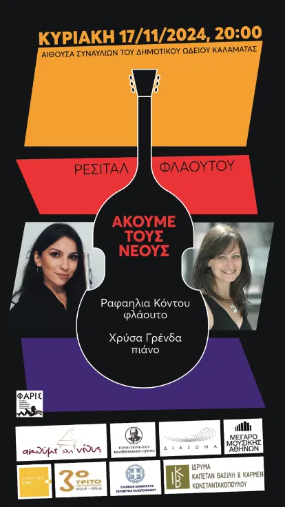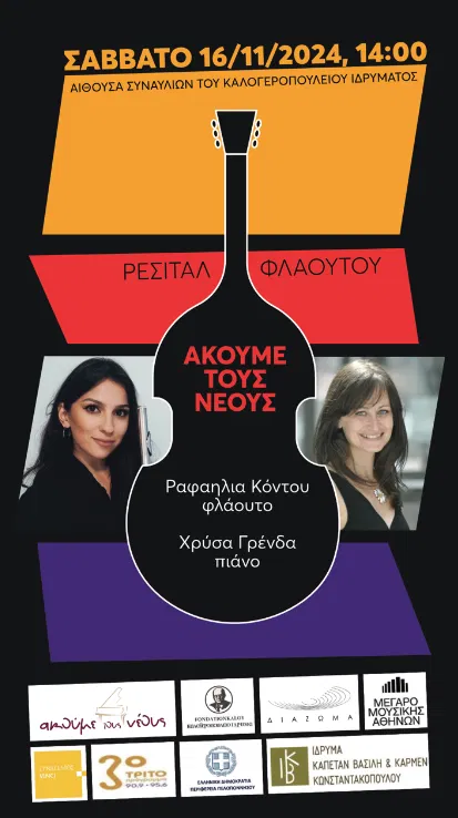 - Σάββατο 16 Νοεμβρίου: Ρεσιτάλ φλάουτου της Ραφαηλίας Κόντου στο Καλογεροπούλειο Ίδρυμα Κορίνθου. Στο πιάνο θα συμπράξει η αναγνωρισμένη πιανίστα Χρύσα Γρένδα.Η συναυλία ηχογραφήθηκε και υλικό της ηχογραφησης θα παρουσιαστεί στην εκπομπή του Χρίστου Παπαγεωργίου “Η Κυρία με τη Στρυχνίνη”, στις 25.11.2024