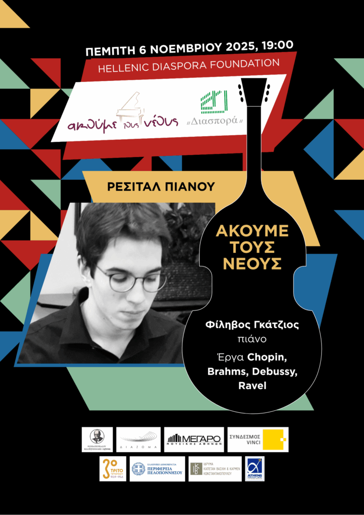 Ο Φίληβος Γκάτζιος, νέος και ταλαντούχος πιανίστας, νικητής του διαγωνισμού “Ακούμε τους Νέους 2025» θα παρουσιάσει ένα ρεσιτάλ πιάνου με έργα Chopin, Brahms, Rachmaninov και Ravel. Μια μοναδική εμπειρία ανάμεσα σε σπουδαία έργα Σύγχρονης Τέχνης σημαντικών Ελλήνων καλλιτεχνών της Διασποράς, που δημιούργησαν πέρα από τα σύνορα σε Αμερική,Γαλλία και σε άλλες χώρες κατά τον 20ό αιώνα.